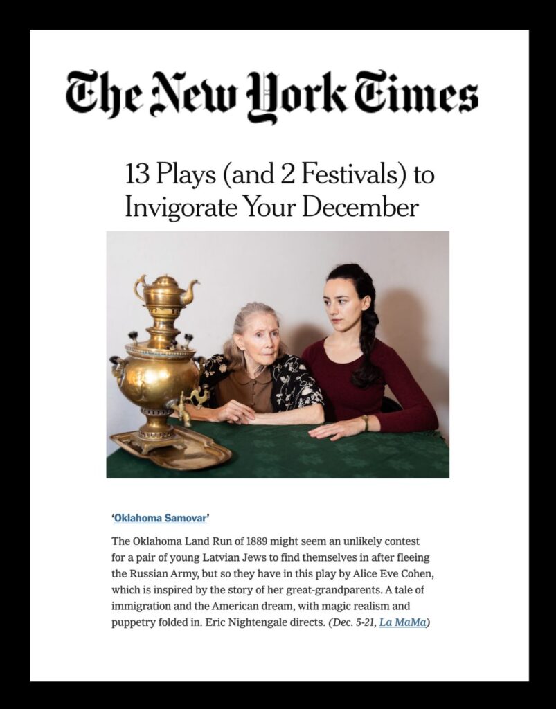 In 1887, two Latvian teenagers flee the Russian Army and become the only Jews in the Oklahoma Land Run. A hundred years later, twenty-year-old Emily tries to decipher her late mother’s mysterious request to have her ashes spread on a stranger’s farm, in a place she has never heard of. Based on the playwright’s ancestors, the only Jews in the Oklahoma Land Run, the play wrestles with themes of immigration, assimilation, generational trauma, and the transcendent power of mother-daughter love. In Oklahoma Samovar, five generations put down roots and dig graves, embodying their own Jewish variations on the turbulent and mythologized American Dream. It is an utterly human and absolutely unique American story.